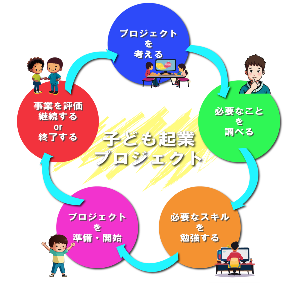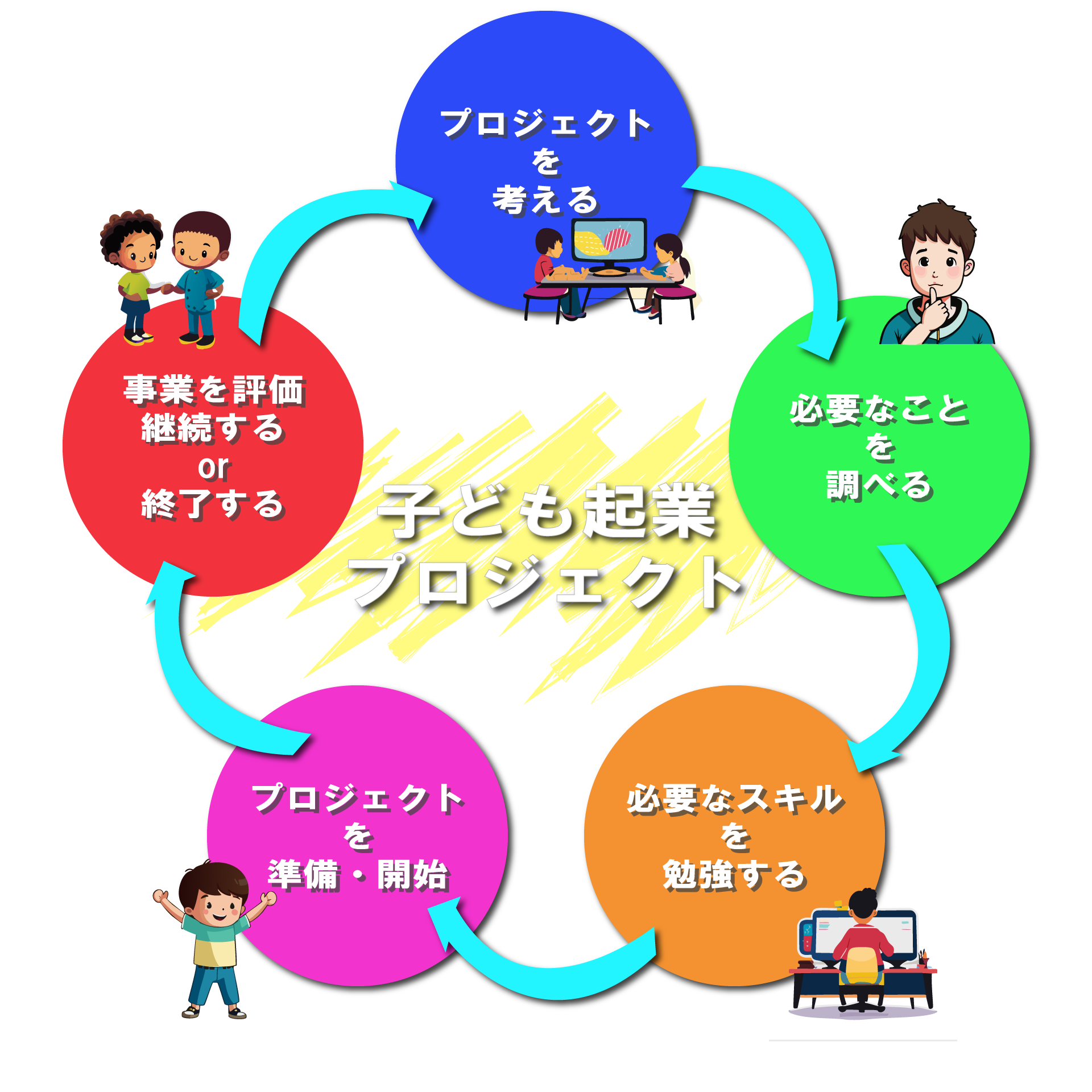 このプロジェクトでは子ども達自身が事業を企画しメンバー全員でその企画を起業という形で実現させます。事業の実現に必要そうなスキルはプロジェクト内外で学習しながら形にしていきます。