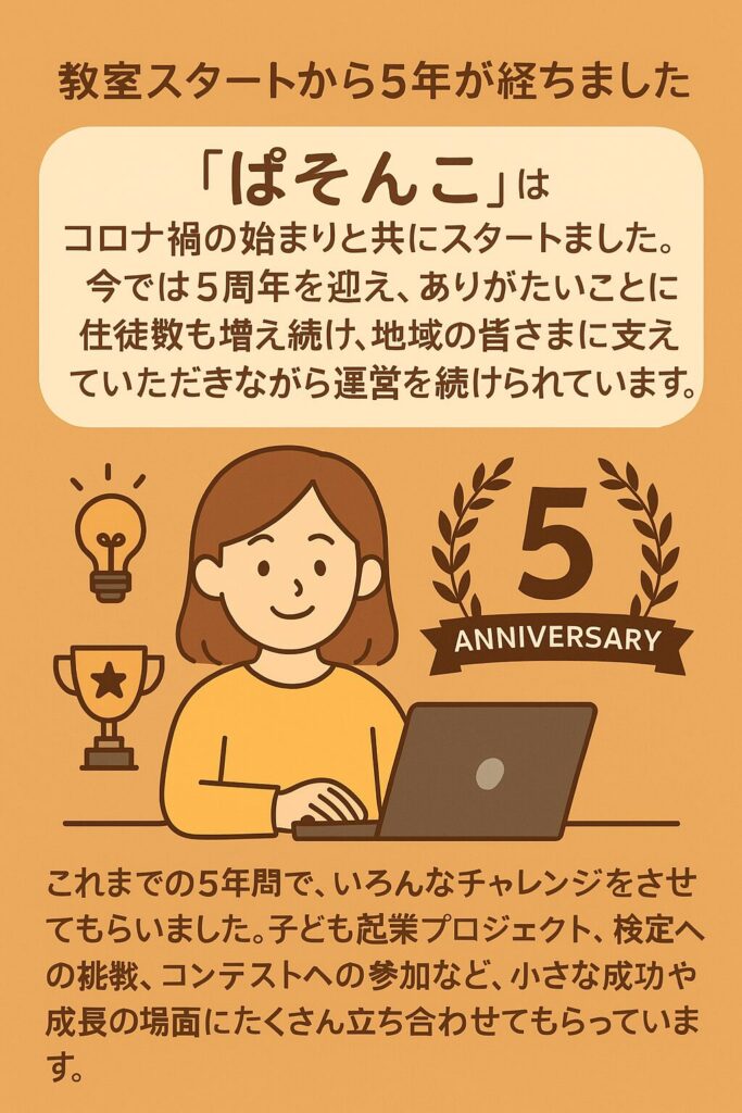 「ぱそんこ」はコロナ禍の始まりと共にスタートしました。今では5周年を迎え、ありがたいことに生徒数も増え続け、地域の皆さまに支えていただきながら運営を続けられています。
