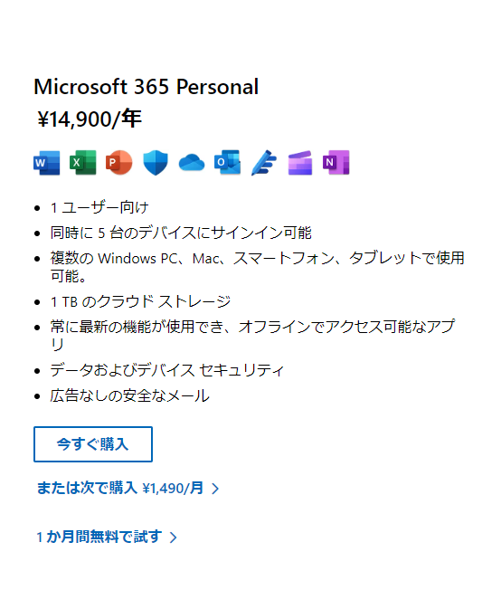 月額払いの場合月1490円が通常の値段ですね!1TBのクラウドストレージがついていることと、常に最新のofficeを扱えるのが最大のメリットですね。一年分をまとめて払うと2980円の割引になりますね!