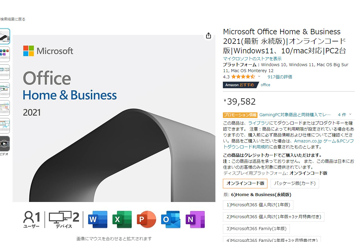 Amazon内の買い切りofficeになります!オンラインコードで購入すると4000円くらいお得になりますね!これはだいぶ違います。ただ正規のライセンスとは思えない格安のライセンスも多数発見しました。安いからといって微妙なライセンスを選ばないように注意しましょう^^